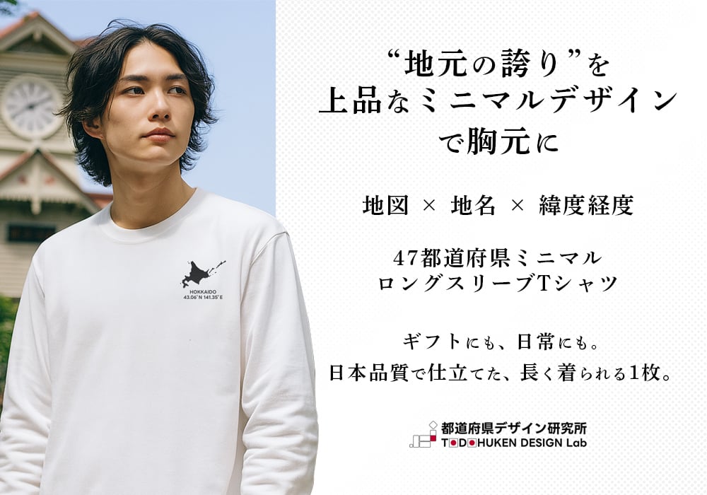 《北海道》 緯度経度ミニマルロングスリーブTシャツ|地図×緯度経度×ワンポイントデザイン